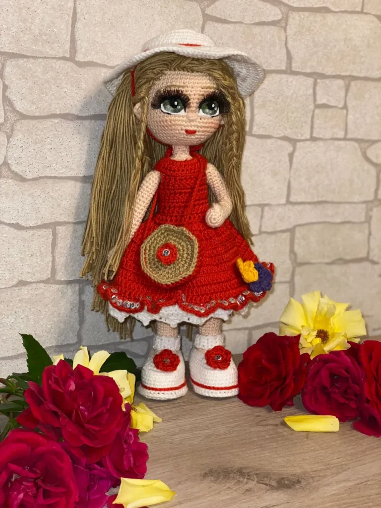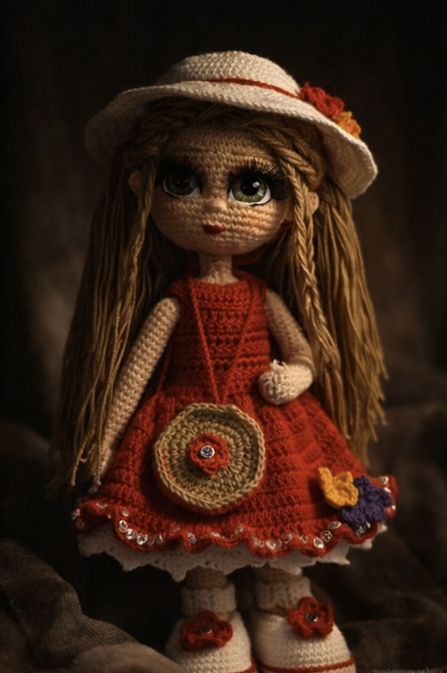 Papusa crosetata manual din fire de bumbac cu acril, cu umplutura hipoalergenica, paiete cusute manual. Ochi brodati, gene pentru jucarii. In interior schelet de sarma, se pot indoi mainile si picioarele. Hainutele si pantofiorii se pot scoate.